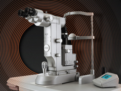 眼軸(眼球の長さ)の測定や角膜の形状の測定を行います。主には白内障の手術前検査として用い、白内障手術で眼内に挿入する眼内レンズの度数決定に不可欠な測定機器です。目の長さを0.01㎜の精度で測定できます。
