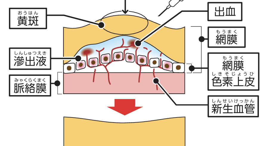 網膜の腫れ(黄斑浮腫など)や新生血管の増殖などは眼内にVEGF(血管内皮増殖因子)という物質が増えることにより生じます。